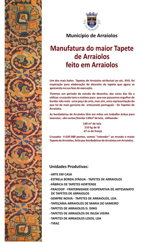 Este projeto teve inicio em 2010, propondo-se a concepção e manufatura do maior tapete de Arraiolos, feito em Arraiolos.
